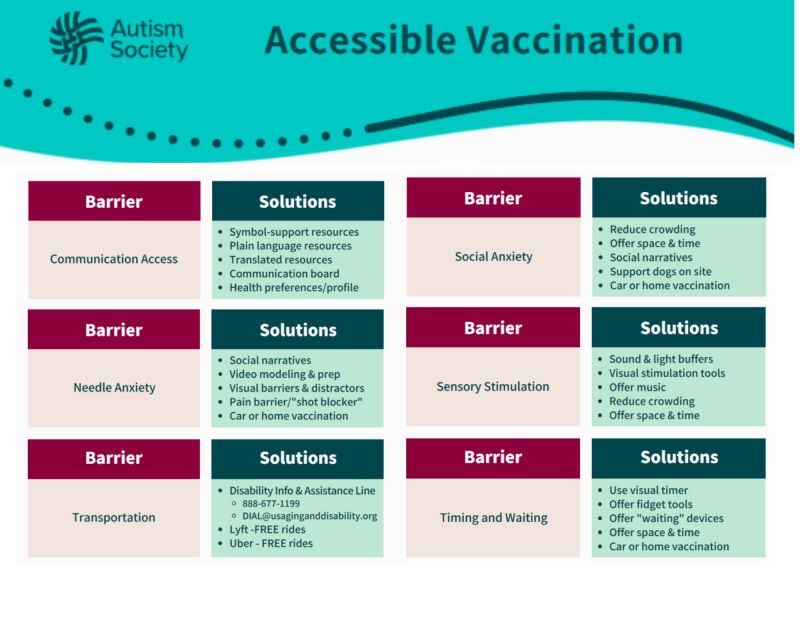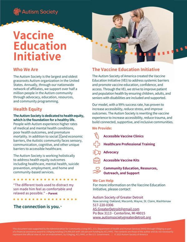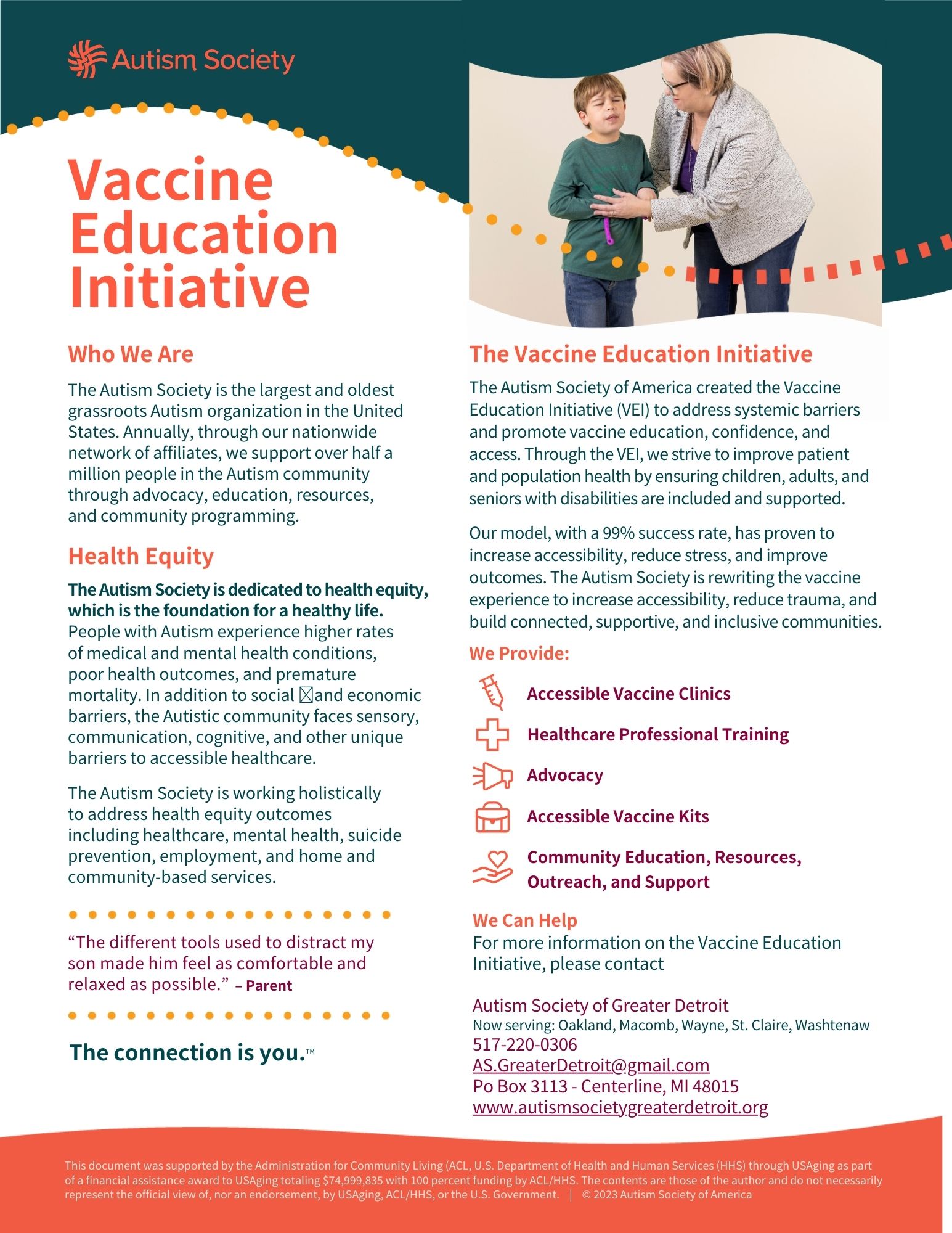 The Autism Society of America believes that improving the vaccination experience is a critical step towards achieving more equitable healthcare for people with Autism and all neurodiverse individuals. As part of our strategic focus on health equity, the Vaccine Education Initiative (VEI) is a national program that addresses systemic barriers, while promoting vaccine education, confidence, and access.