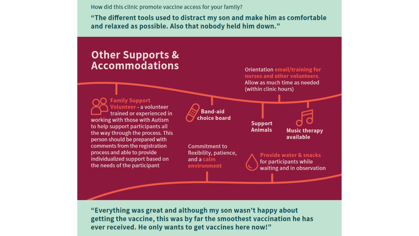 Create accessible vaccination procedures and environments through compassionate care, accessible physical environments, accessible
